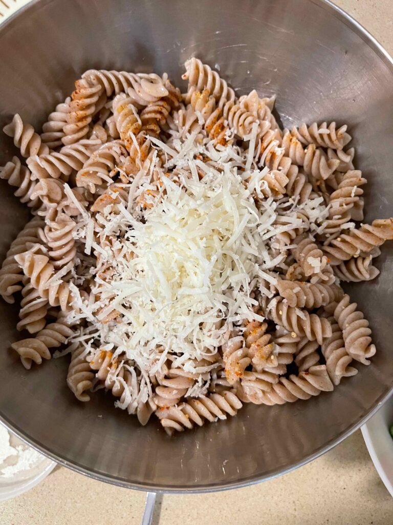 את הפסטה נעביר לקערה ונשים שמן זית, פרמז׳ן ותבלינים ונערבב היטב.